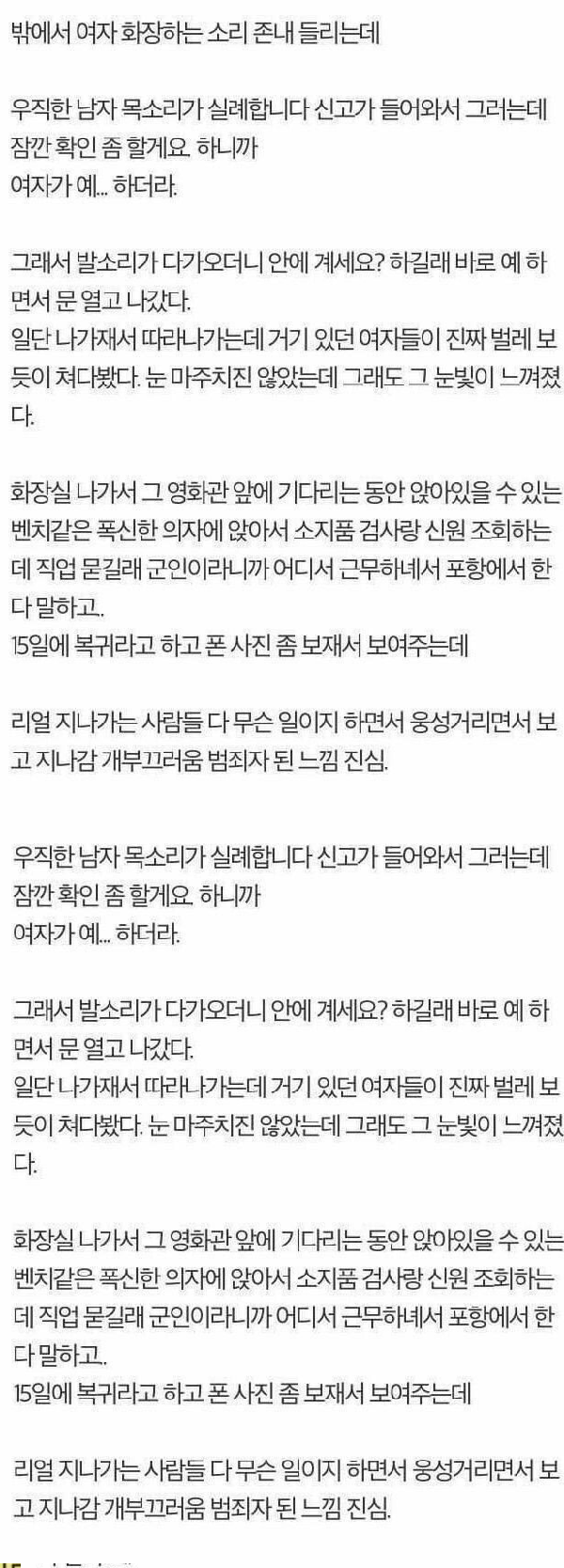 A씨는 “경찰관 따라 나가는데 거기 있던 여자들이 진짜 벌레 보듯 쳐다봤다”며 “영화관 의자에서 소지품 검사랑 신원 조회하는데 직업 묻길래 군인이라고 했다”고 말했다.