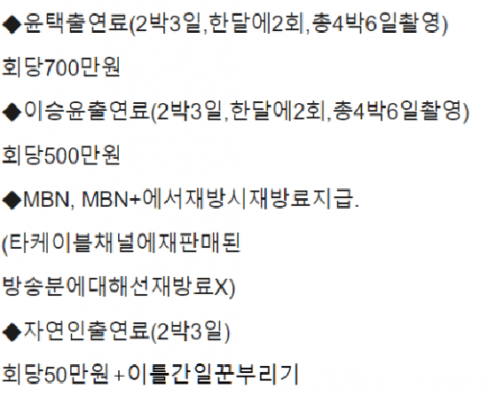 윤택은 회당 출연료 700만 원을 받고, 이승윤은 회당 500만 원 받는다. 여기에 재방송을 할 경우 재방료를 추가로 지급한다.
