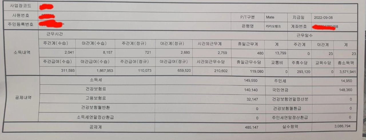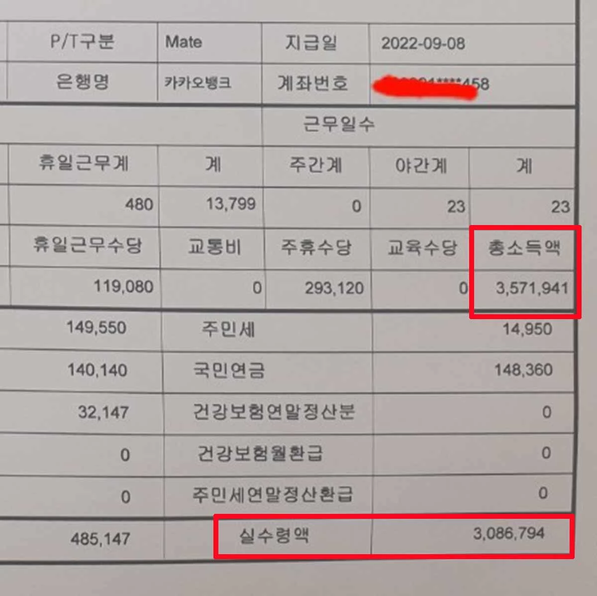 지급일이 지난 8일인 이 급여명세서엔 총소등액(급여)가 357만1941원이고 실수령액이 308만6794원이라고 쓰여 있다.