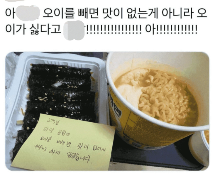 한 커뮤니티에 김밥에 들어가는 오이를 빼달라고 요청했음에도 쪽지와 함께 오이가 그대로 들어간 김밥을 받은 네티즌의 글이 올라왔다.