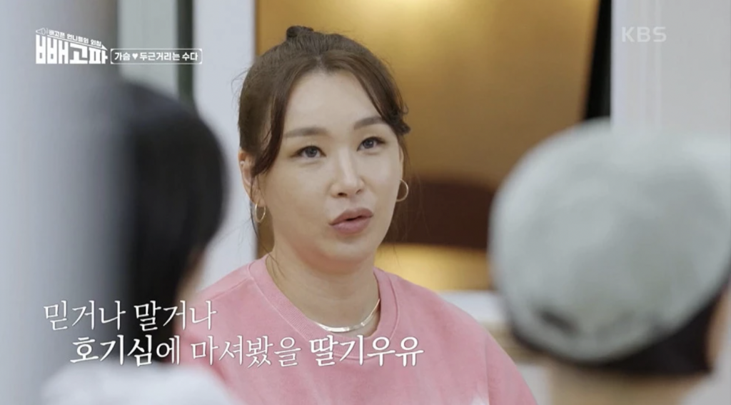 대화의 화제는 자연스럽게 ‘가슴 커지는 법’으로 이어졌고, 이에 배윤정은 “딸기 우유 먹으면 가슴 커진다고 하지 않냐”고 말했다.