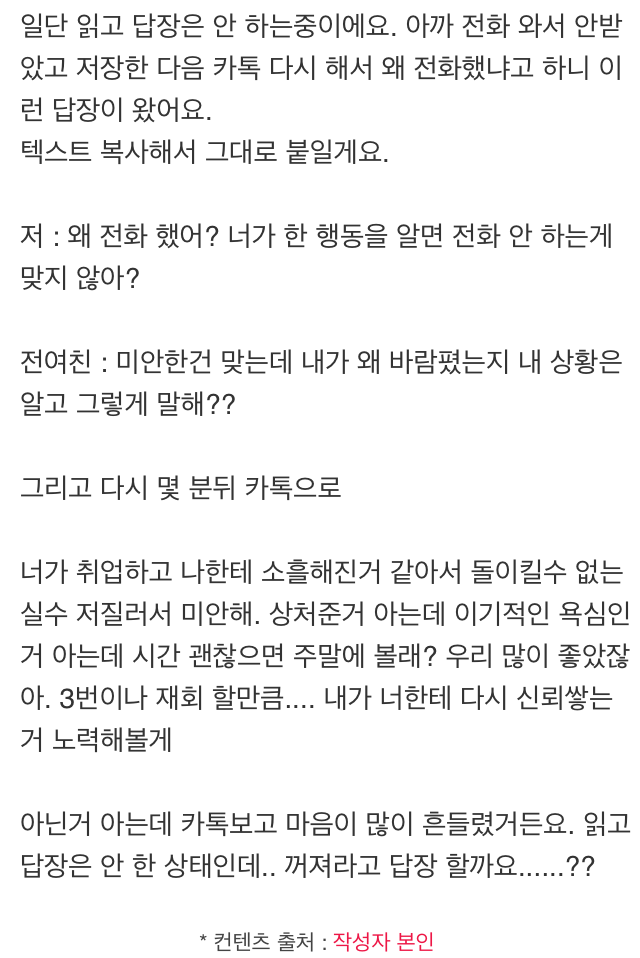 그러자 전여친은 “미안한건 맞는데 내가 왜 바람 폈는지 내 상황은 알고 그렇게 말하냐”고 되물었다.