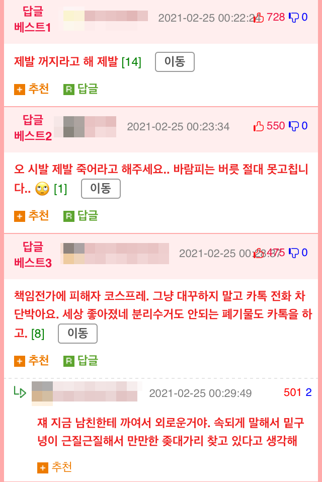 누리꾼들은 “제발 꺼지라고 하세요”, “바람 피는 버릇은 절대 못 고칩니다”, “책임전가에 피해자 코스프레. 그냥 대꾸하지 말고 차단하세요” 등의 반응을 보였다.