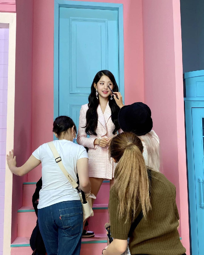 해당 사진 속 장원영은 날씬한 몸매가 돋보이는 분홍색 수트를 입고 자신감 넘치는 포즈를 취하고 있다. 여기에 누드톤 구두를 매치해 발과 다리가 연결돼 쭉 뻗어 보이는 효과를 줬다.