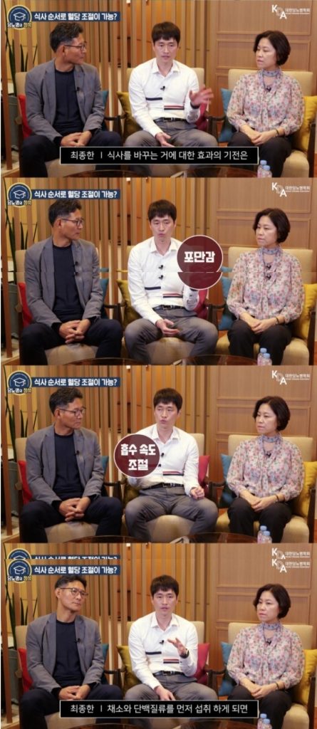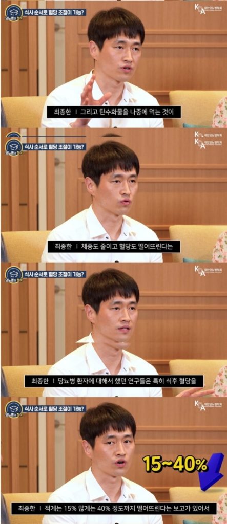 해당 영상에서 최종한 건국대 내과 전문의는 “같은 음식을 먹어도 채소나 단백질을 먼저 먹으면 탄수화물을 먼저 먹는 것보다 체중도 줄고 혈당도 떨어져 살이 덜 찐다”고 밝혔다.