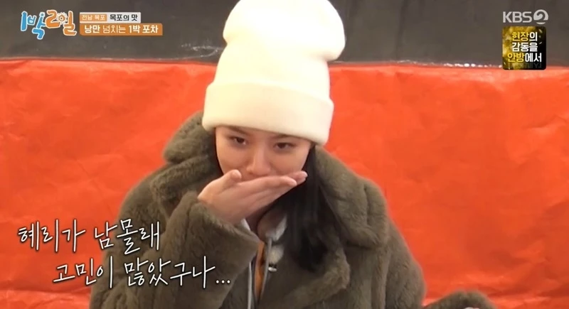 지난 26일 방송된 KBS 예능 프로그램 ‘1박 2일 시즌4’에는 혜리가 게스트로 출연했는데, 이날 ‘1박 2일’ 멤버들과 전남 목포에서 맛 여행을 즐긴 혜리는 포장마차에서 진솔한 이야기를 나누는 시간을 가졌다.