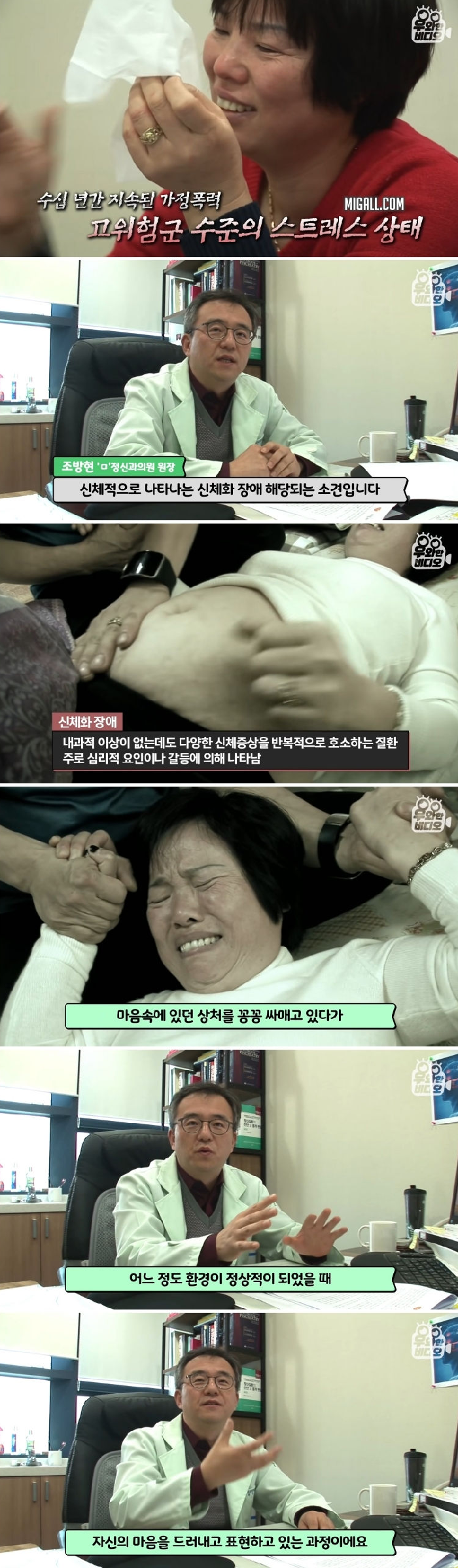 마음속에 있던 상처를 꽁꽁 싸매고 있다가 어느 정도 환경이 정상적이 되었을 때 자신의 마음을 드러내고 표현하고 있는 과정”이라고 전했다. 수십 년간 계속된 가정폭력으로 고위험군 수준의 스트레스가 쌓였기 때문.