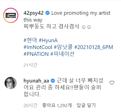 현아는 “근데 살 너무 빠지셨다. 관리 좀 하세요!! 팬들이 슬퍼합니다”라고 적었다.