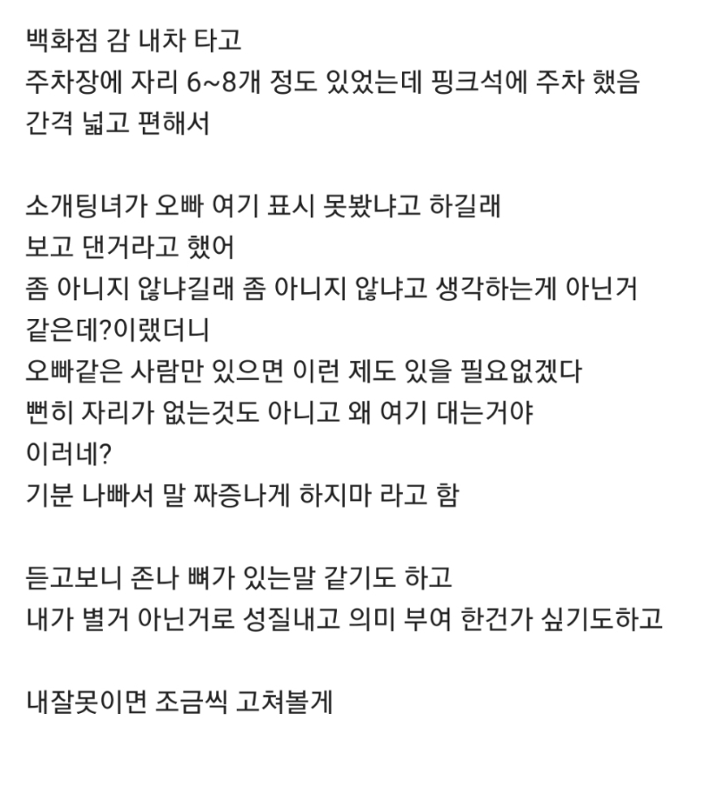 남성 A씨는 얼마 전 여성 B씨와 소개팅을 했다. 두 사람은 소개팅 후 백화점으로 갔다. A씨는 “주차장에 자리 8개 정도 남아있었는데 간격이 넓고 편해서 핑크석에 주차했다”고 설명했다.