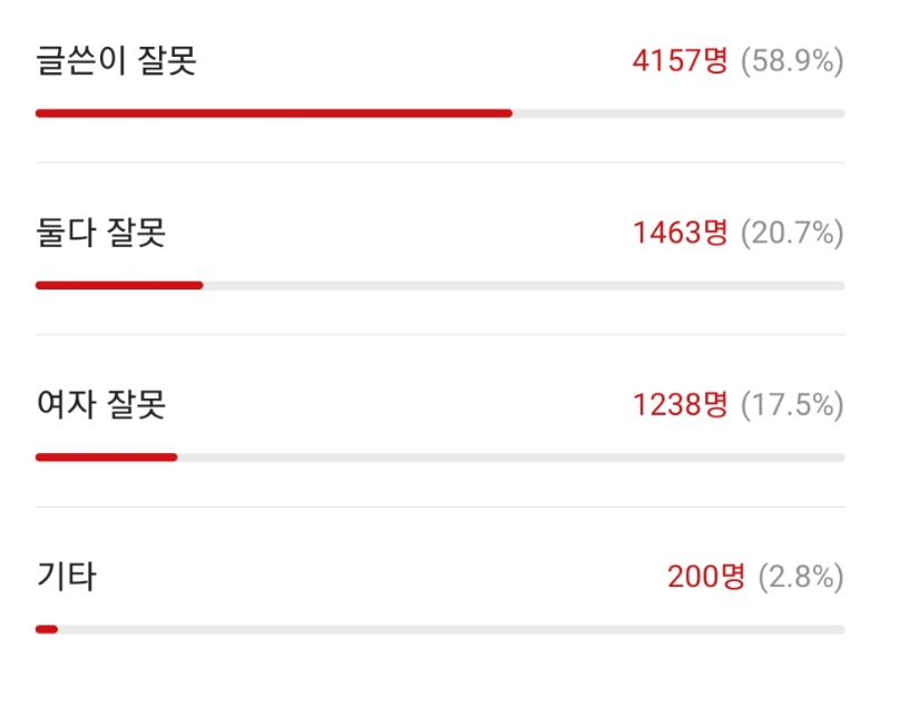 그러자 절반이 넘는 네티즌들은 A씨가 잘못했다고 지적했다. 반면 ‘여자 잘못’이라는 의견은 약 17%를 차지했다.