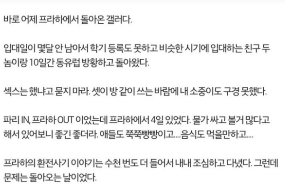 이 글의 작성자 A씨는 자신이 어제 프라하에서 돌아왔다며 이야기 보따리를 풀었다.
