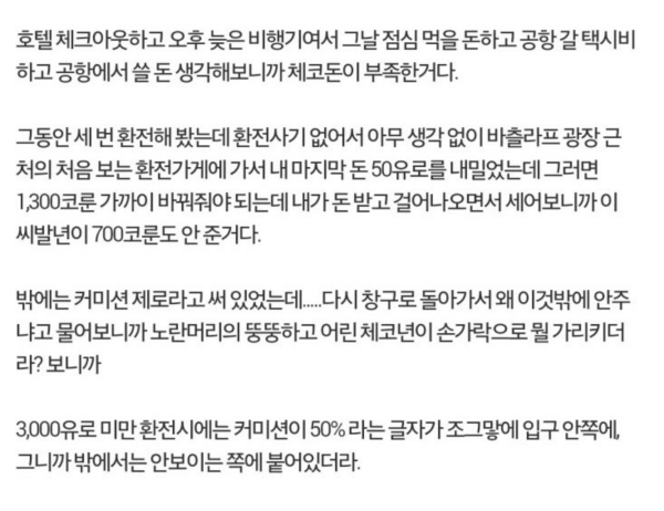 여행 기간동안 세 번 환전했지만 한 번도 사기가 없었기에 아무 생각 없이 바츨라프 광장 근처의 처음 보는 환전가게서 마지막 돈 50유로를 건넸는데 원래 환율대로라면 1,300코룬 가까이 줘야하는데 돈 받고 나오면서 확인해보니 700코룬도 안 줬다고 한다.