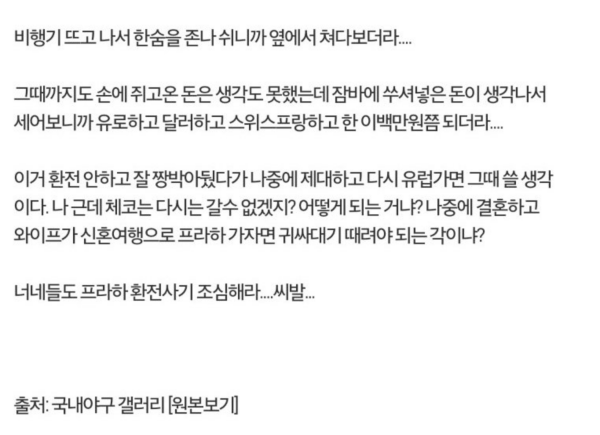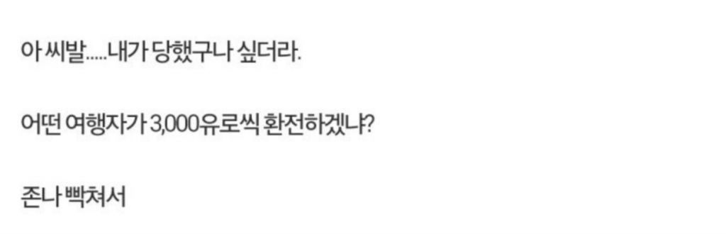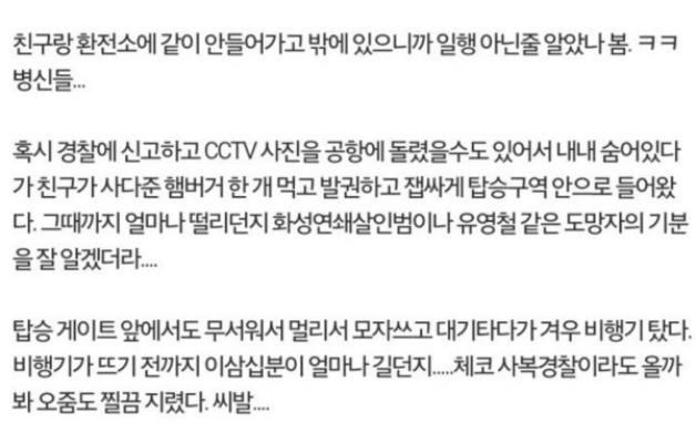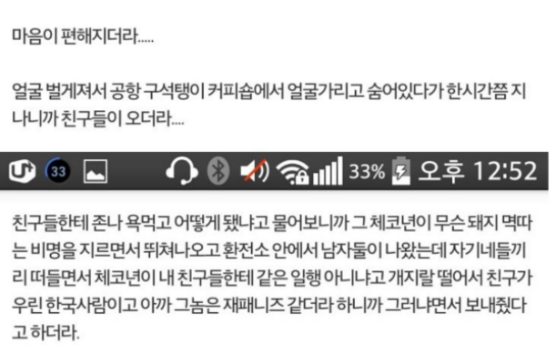 A씨는 친구들에게 어떻게 됐냐고 물으니 “그 체코X이 무슨 돼지 멱따는 비명을 지르면서 뛰쳐나오고 환전소 안에서 남자둘이 나왔는데 자기네들끼리 떠들면서 체코x이 일행 아니냐며 뭐라해서 우린 한국사람이고 아까 그놈은 재패니즈 같다고 했다”고 한다.