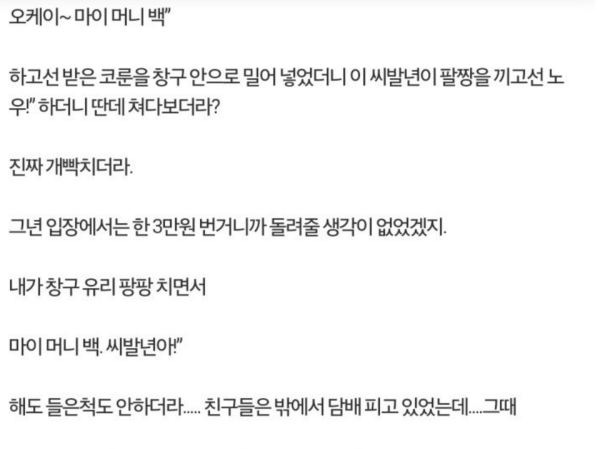 그래서 화가 날대로 난 A씨는 창구 유리를 치면서 “마이 머니백!!.씨X년아!”라고 소리를 질렀지만 들은 척도 안하고 있었고, 나머지 친구들은 밖에서 담배 피고 있었다.