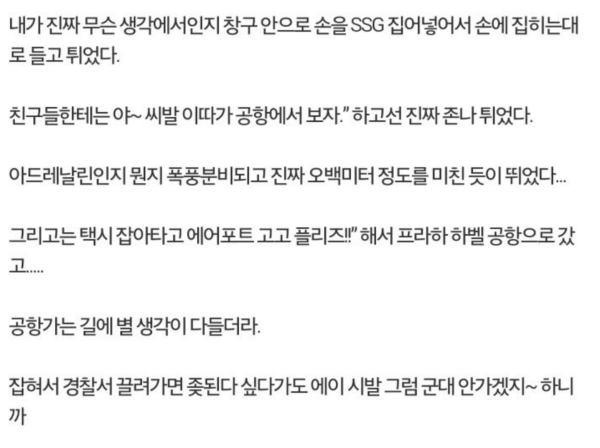 밖에서 담배피고 있던 친구들에겐 “야 ~씨X 이따가 공항에서 보자” 하고선 미친듯이 도망갔다.