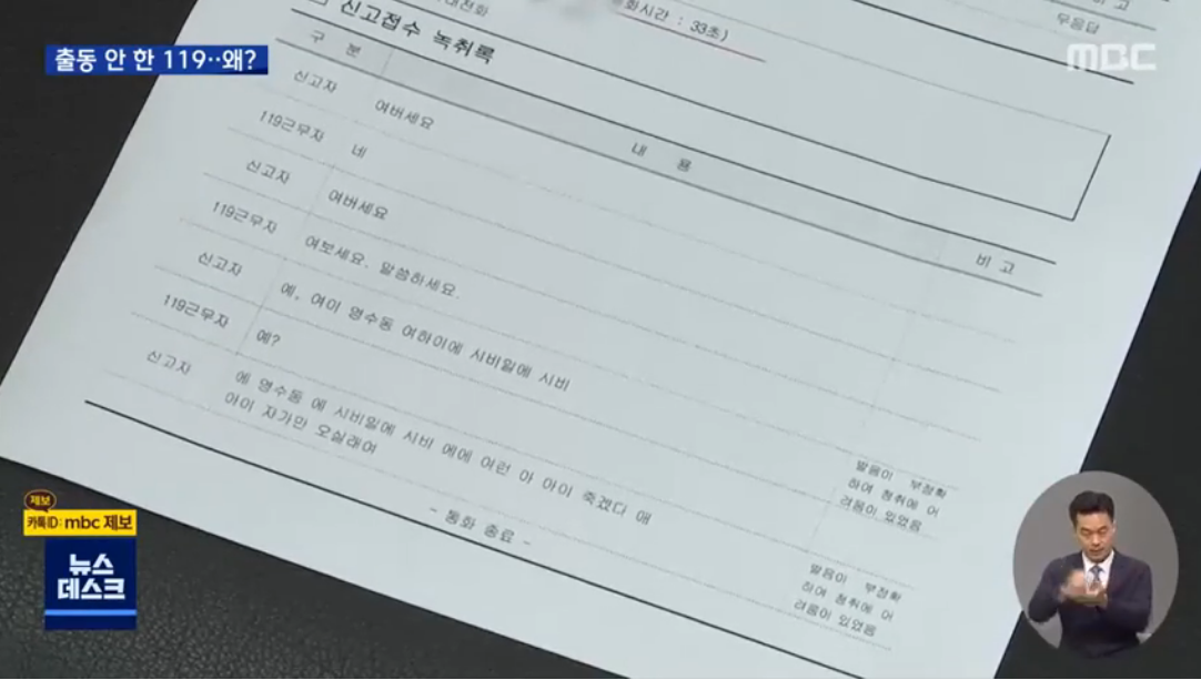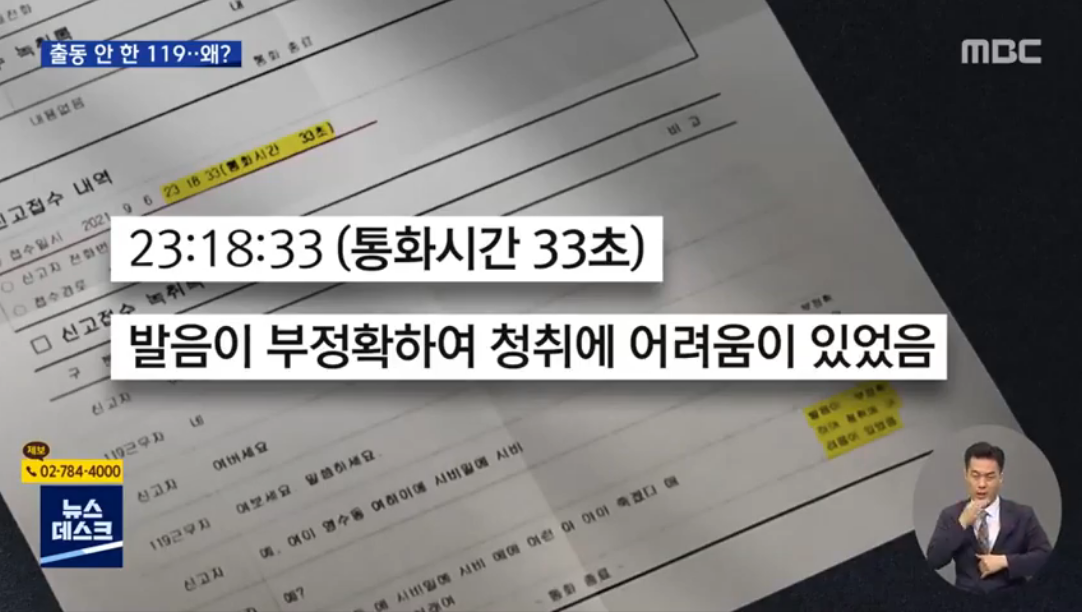 신고 당시 녹취록을 살펴보자 첫 번째 신고는 받자마자 끊겨 ‘무응답’ 처리됐고, 10초 뒤 두 번째 신고는 33초간 통화했지만 “발음이 부정확해 청취에 어려움이 있었다”고 적혀 있었다.