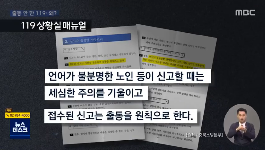 119 상황실 매뉴얼에는 “언어가 불분명한 노인 등이 신고할 때는 세심한 주의를 기울이고, 접수된 신고는 출동을 원칙으로 한다”고 돼 있었지만 해당 지침은 지켜지지 않아 논란이 되고 있다.