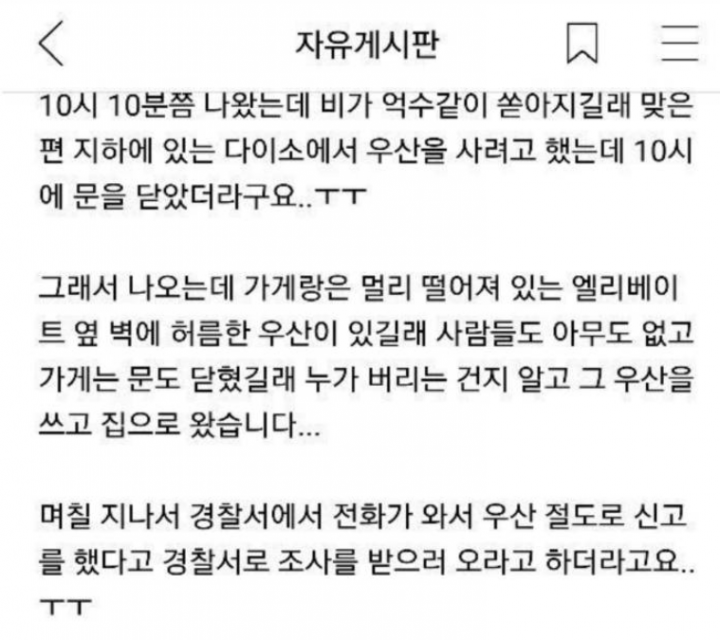 하지만 A 씨는 며칠 뒤 우산 절도죄로 경찰서에 조사를 받으러 오라는 충격적인 연락을 받게 됐다.