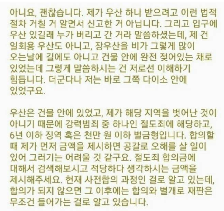 B 씨가 보낸 문자에는 “제가(B) 우산 하나 받으려고 법적 절차 거치며 신고한 게 아니다”며”우산이 건물 안에 있었고 제가 해당 지역을 벗어난 것이 아니어서 강력범죄 중 하나인 절도죄에 해당한다”고 써있었다.