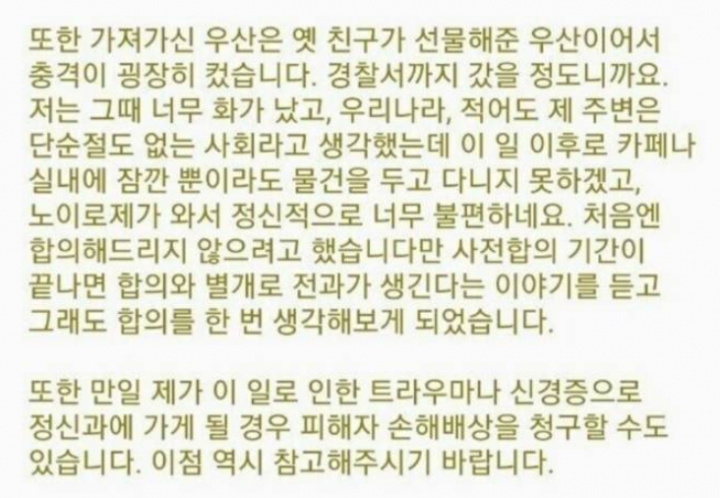 이어 “이는 6년 이하의 징역 혹은 천만 원 이하의 벌금이다”며”해당 우산은 옛 친구가 선물해준 우산이라 충격이 크고 노이로제가 와 정신적으로 불편하다”고 말했다.
