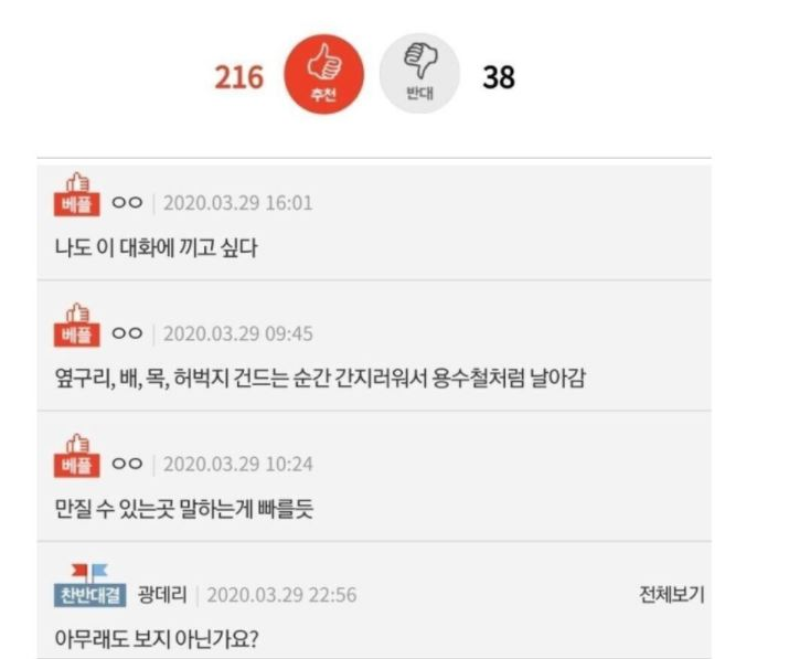 누리꾼들은 “나도 이 대화에 끼고 싶다”며 남자친구가 없다고 말했고, “옆구리, 배, 목, 허벅지 건드는 순간 간지러워서 용수철처럼 날아감”이라며 글쓴이처럼 간지러움을 참지 못한다고 말했다.