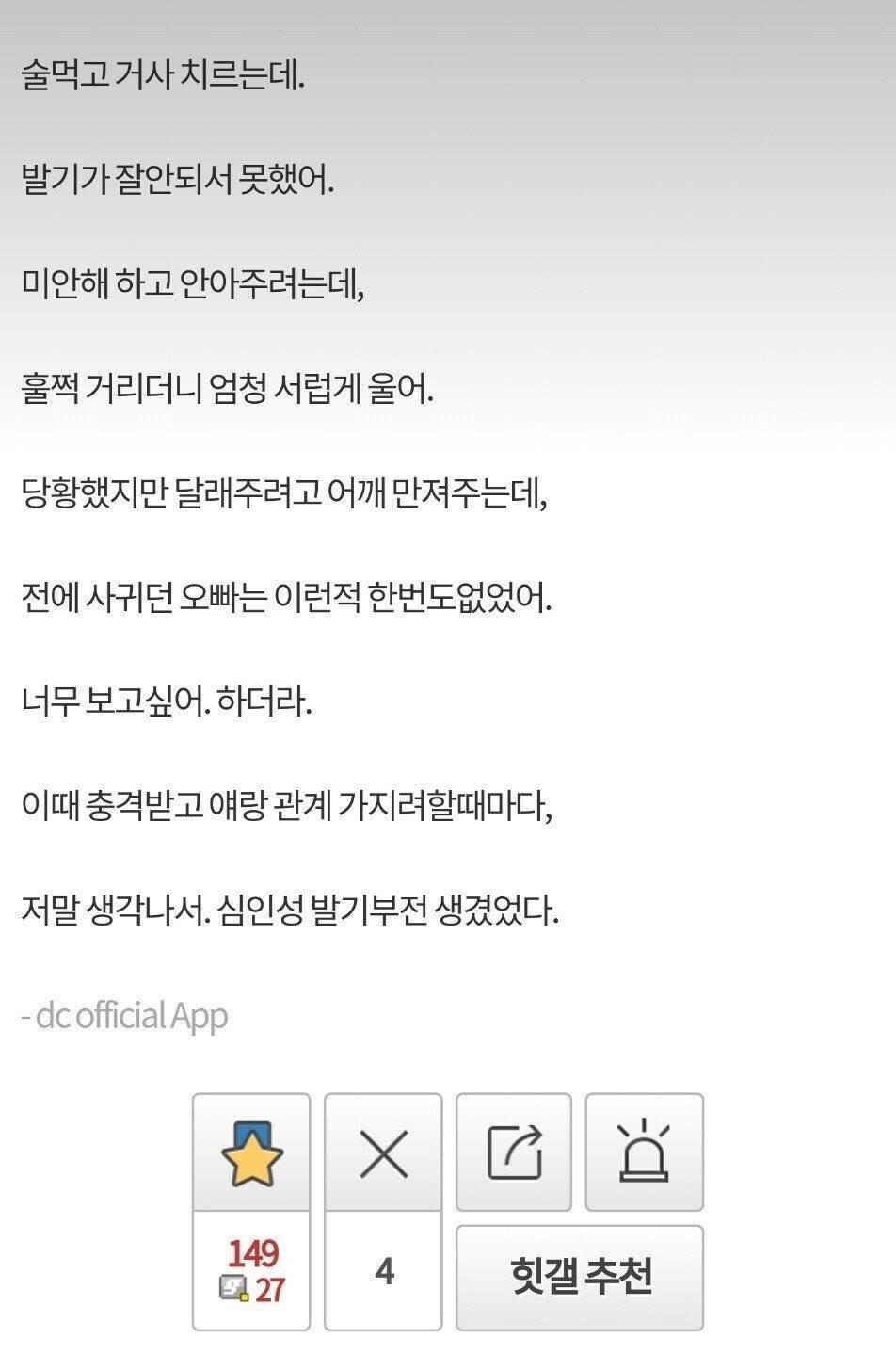 그곳이 잘 서지 않아서 하지 못하게 돼 미안해하고 안아주려는데 여자친구는 훌쩍거리더니 엄청 서럽게 울기 시작했다.