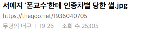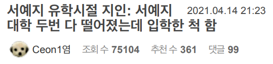 각종 온라인 커뮤니티에는 “서예지 유학시절 지인 : 서예지 대학 두번 다 떨어졌는데 입학한 척 함”라는 제목의 글이 올라와 누리꾼들 사이에서 엄청나게 화제가 되고 있다.
