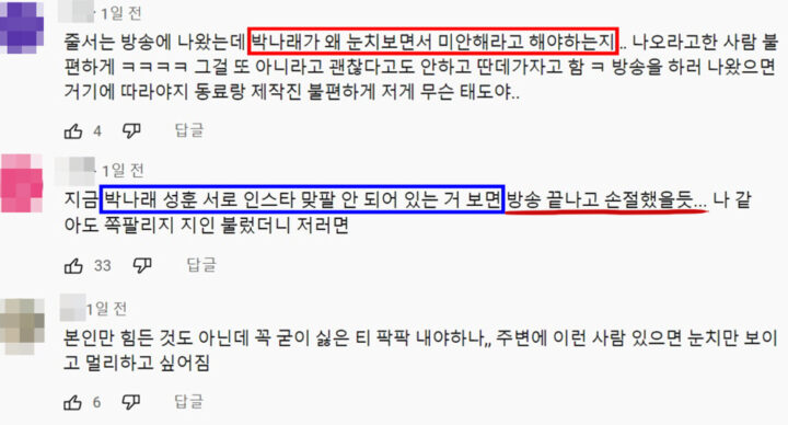 온라인 커뮤니티에는 박나래가 성훈과 손절을 했다는 글이 올라와 누리꾼들 사이에서 화제가 되고 있다.