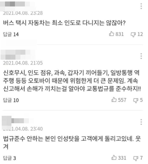 “버스, 택시, 자동차는 최소 인도로 다니지는 않는다”, “무슨 말도 안되는 소리하고 있냐?”, “본인이 법규 준수 안지켜놓고 고객 탓하고 있네”
