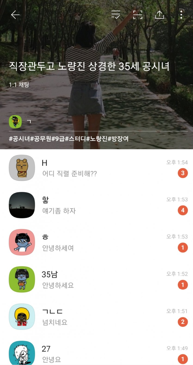 A씨는 “직장 관두고 노량진 상경한 35세 공시녀”라는 제목의 채팅방을 개설해 사진 한 장을 공개했다. 사진 속에는 청치마와 티셔츠를 입고 포즈를 취한 여성의 모습이 담겼다. 그는 ‘#공시녀’, ‘#노량진’, ‘#공부원’, ‘#방장여’ 등 태그를 달았다.