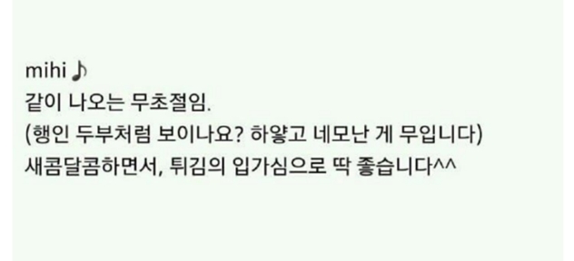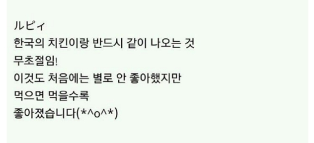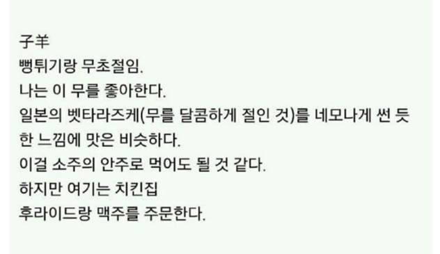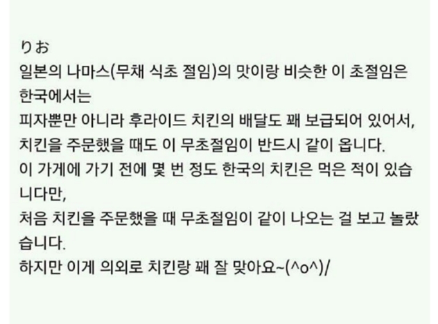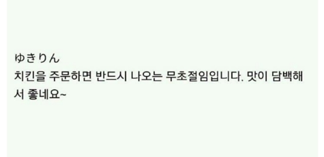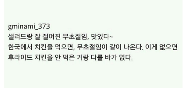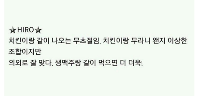 밥의 김치, 피자의 피클, 짜장면의 단무지처럼 치킨이나 통닭과 단짝처럼 함께하는 곁들임 반찬이다.