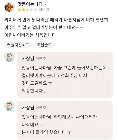 닉네임 ‘맛둥이는나다’는 “싸이버거 안에 닭다리살 패티가 다른 지점에 비해 확연히 아주아주 얇고 껍데기 부분이 반이다. 이런 싸이버거는 처음이다”라며 항의했다.