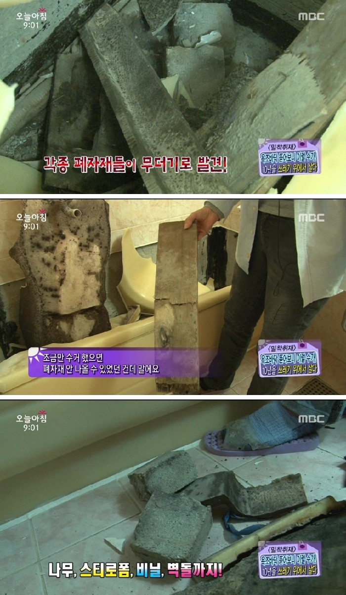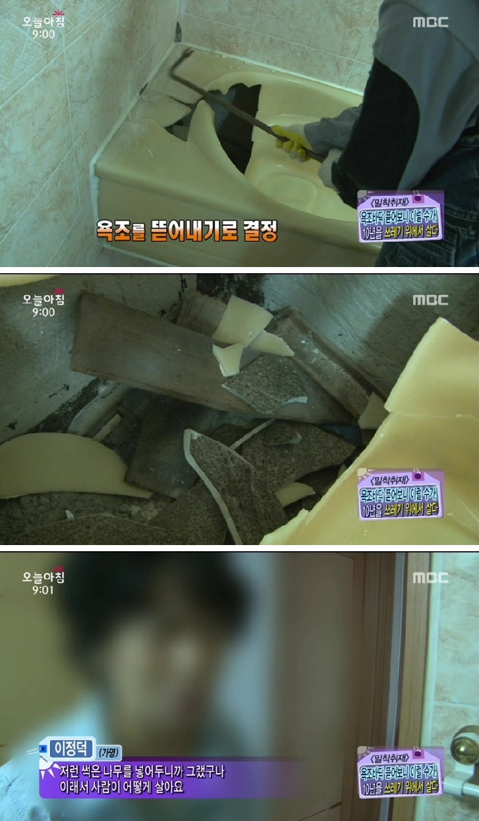 이에 욕실 공사 업체는 “뜯어봐야 (문제 원인)을 알 수 있다. 곰팡이가 많이 쓸었다”고 말했다. 이후 욕조를 뜯어내자 충격적인 모습이 드러났다. 욕조 바닥에는 썩은 나무, 스티로폼, 비닐, 벽돌 등 각종 폐자재 무더기로 발견됐기 때문.