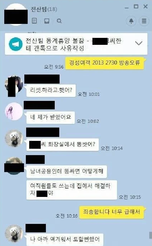작성자는 “생리현상인데…화장실을 분리 해야겠다”는 글과 함께 카카오톡 단체대화방을 캡처한 화면을 첨부했다.