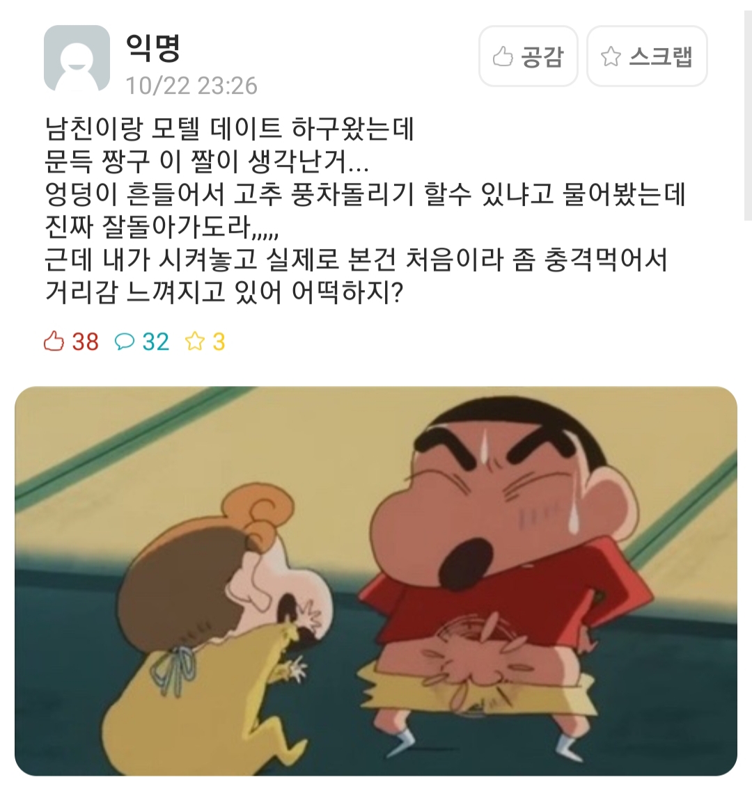 해당 여성은 남친이랑 모텔에서 데이트를 하고 왔는데 문득 짱구 짤이 생각나서 한 번 시켜보기로 결심했다고 한다.