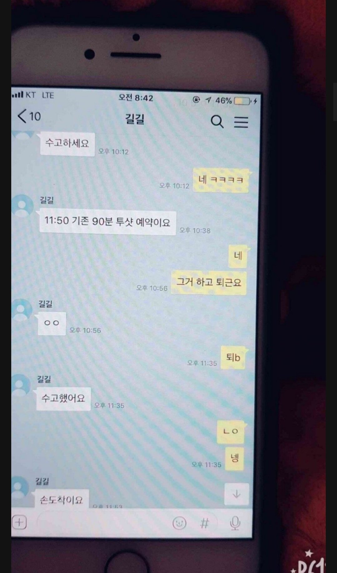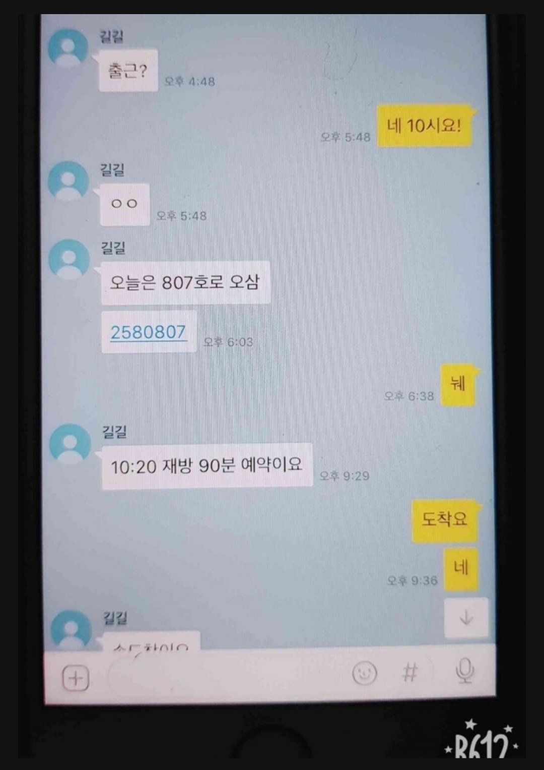 남성이 ‘오늘은 807호로 오삼’, ’10:20 재방 90분 예약이요’ 등의 요구를 한다.