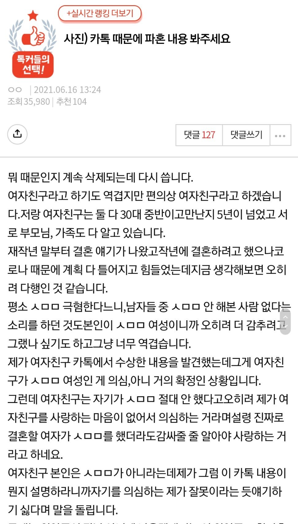 16일 네이트판에는 ‘카톡 때문에 파혼 내용 봐주세요’라는 제목의 글이 올라왔다.