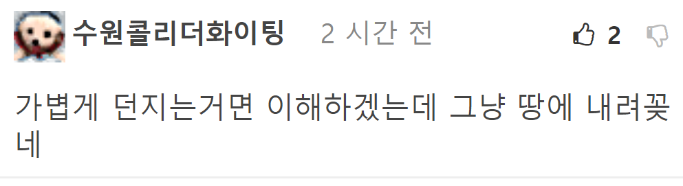 A씨의 게시물을 본 일부 네티즌은 “가볍게 던지는거면 이해하겠는데 그냥 땅에 내려꽂네” 라 댓글을 남겼다.