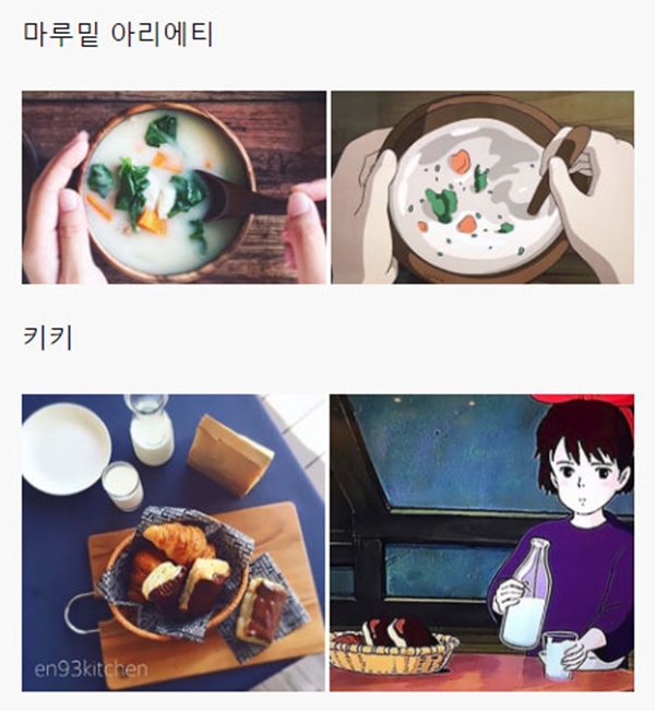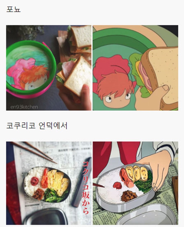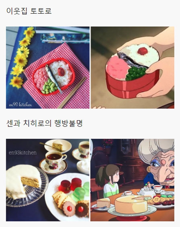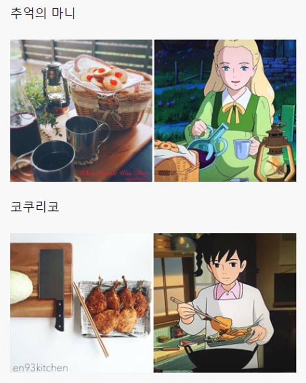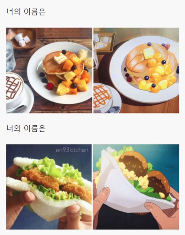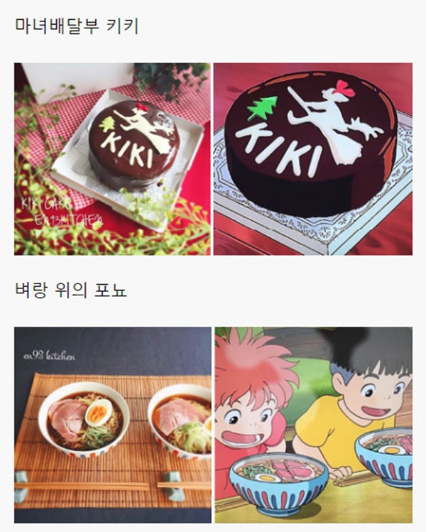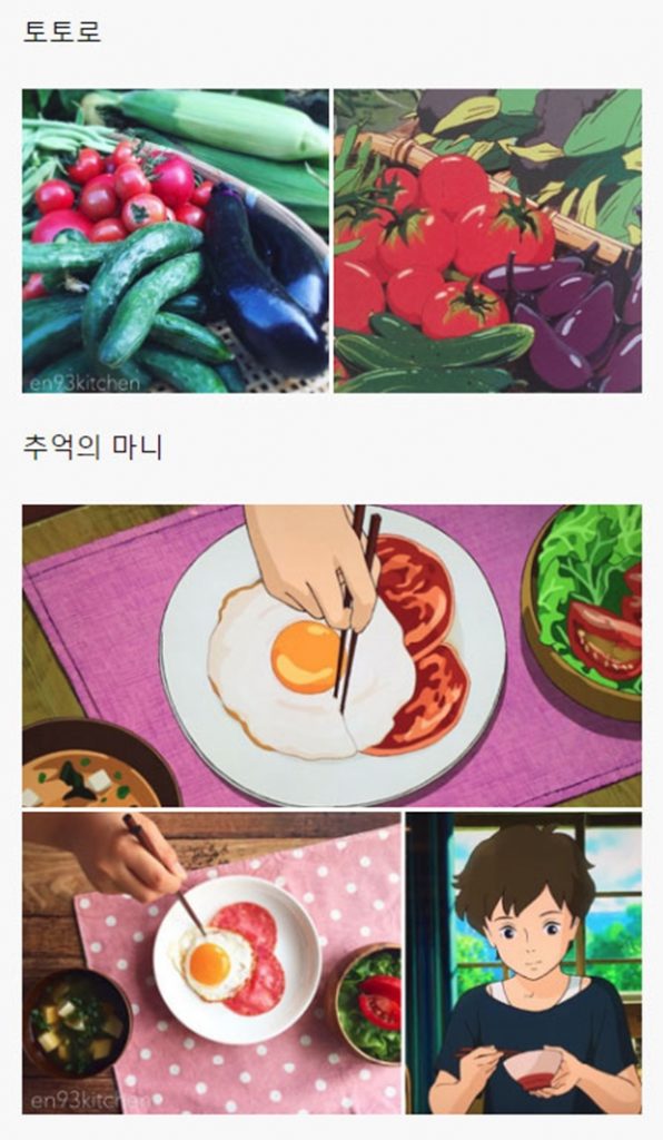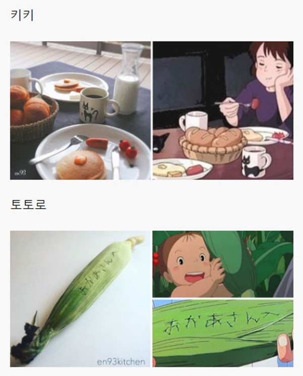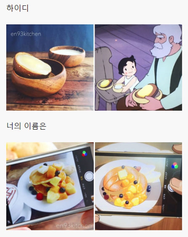 해당 게시물에는 각종 일본 애니메이션, 지브리 스튜디오에서 제작한 애니메이션을 포함해서 최근 세계적으로 선풍적인 인기를 끌었던 ‘너의 이름은’ 같은 최신 애니메이션에 등장하는 음식들을 직접 만들어 본 블로거들의 사진들이 올라와 있었다.