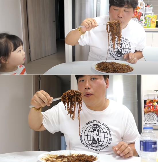 천뚱은 자신이 흡입하는 동안 딸에게는 새모이만큼 라면을 나눠주며 폭소를 자아냈다.