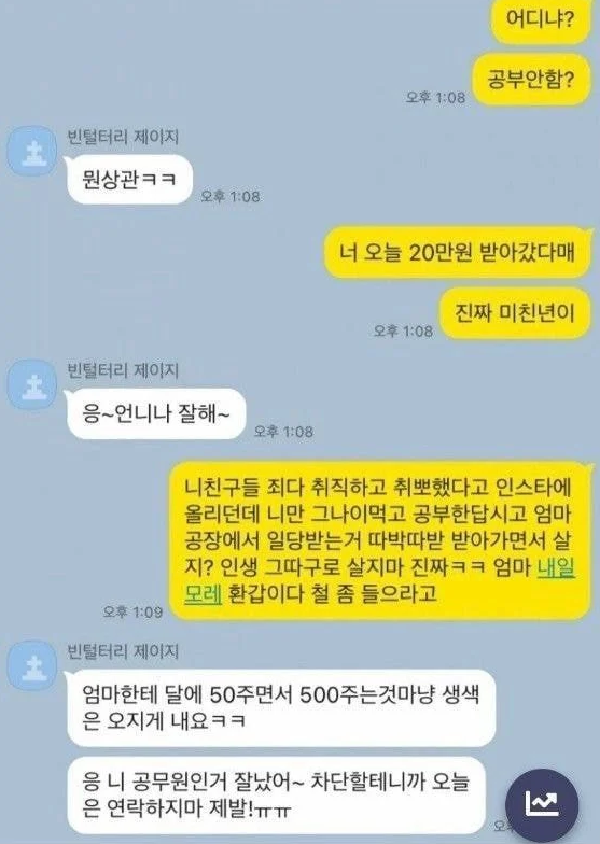 이런 상황에서도 동생은 공부하기는커녕 매일 놀러 다닌다고 전했다. 화가 난 A씨가 “철 좀 들어라”고 하자 동생은 “엄마한테 달에 50주면서 500주는 것 마냥 생색내냐. 차단할 테니까 제발 연락하지 마”라며 적반하장 태도를 보였다.