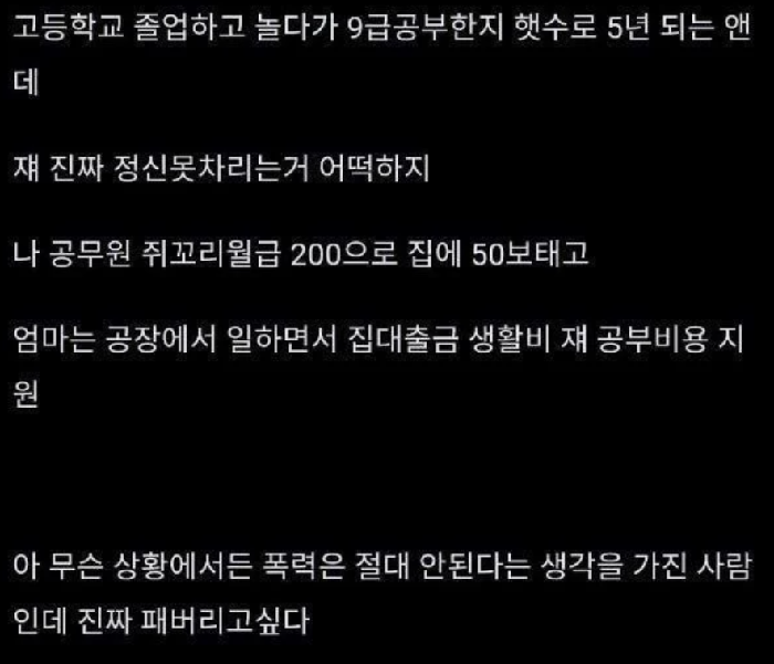작성자 A씨는 “27살 동생이 고등학교 졸업하고 놀다가 9급 공무원 시험을 준비한지 5년 차다. 동생이 진짜 정신 못 차리는데 어떻게 해야 하냐”고 털어놨다.