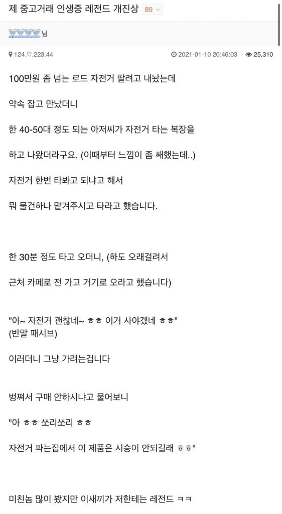 그는 “약속 장소엔 한 40-50대 정도 되는 아저씨가 자전거 타는 복장을 입고 나왔다”며 “이 때부터 느낌이 좀 쎄했다”고 말했다.