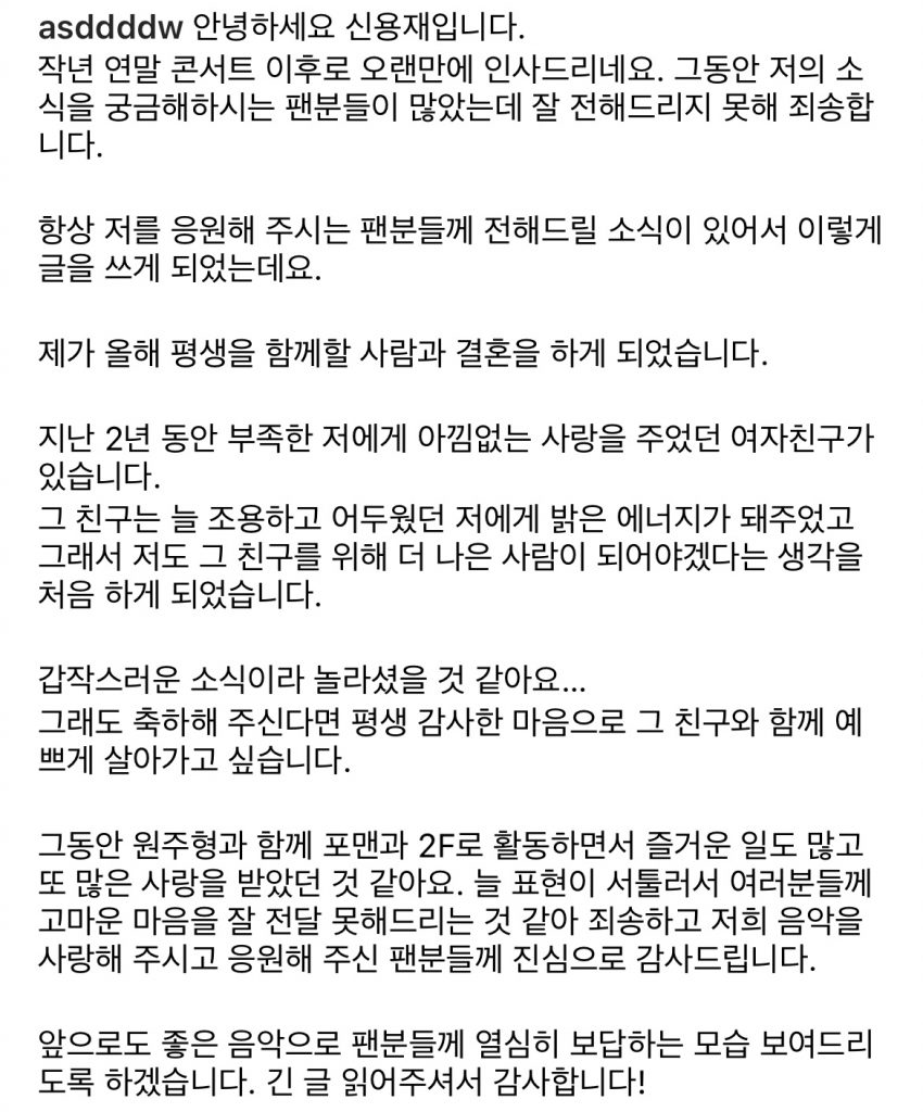그는 “갑작스러운 소식이라 놀라셨을 것 같지만, 축하해 주신다면 평생 감사한 마음으로 그 친구와 함께 예쁘게 살아가고 싶다”고 밝히며, “앞으로도 좋은 음악으로 팬분들께 열심히 보답하는 모습 보여드리도록 하겠다. 긴 글 읽어주셔서 감사하다.”라며 글을 마무리했다.