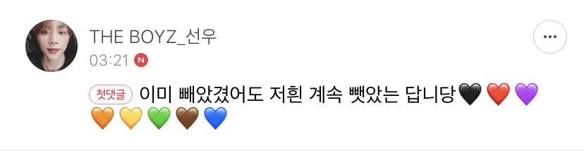 지난 9일 더보이즈 선우가 팬카페에 남긴 댓글이 문제가 됐다.