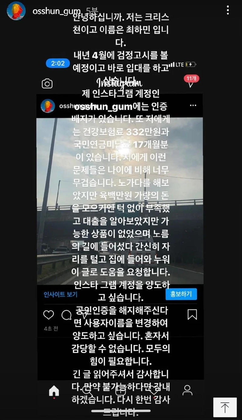 이어 “인스타그램 계정을 양도하고 싶습니다.