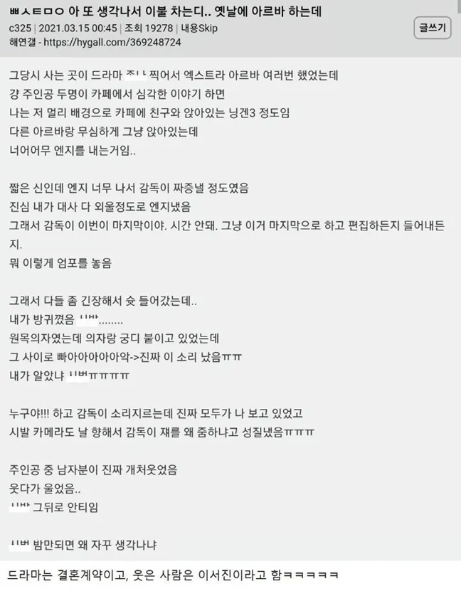 게시글 작성자 A씨는 과거 MBC ‘결혼계약’이라는 드라마에 엑스트라 알바를 갔다.