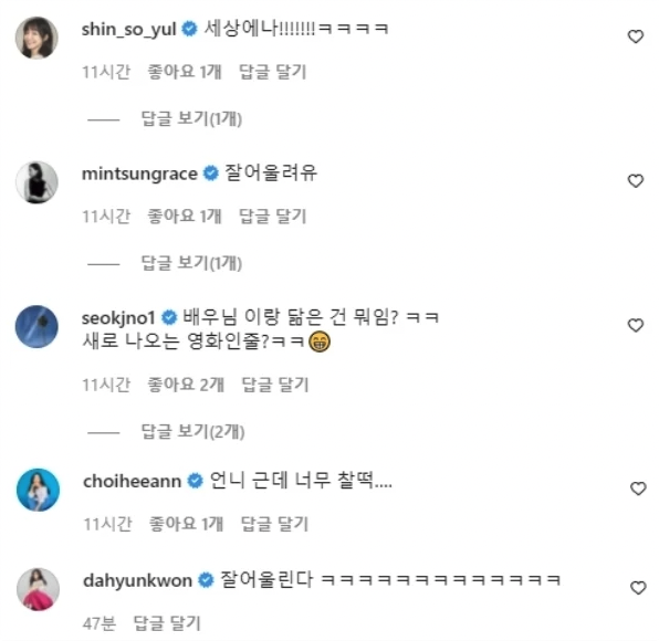 해당 게시물을 접한 배우 박하선, 권다현, 신소율 등은 “잘 어울린다”, “세상에나!!ㅋㅋㅋ” 등의 감탄하는 반응을 보였다.