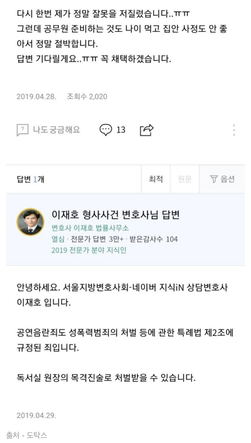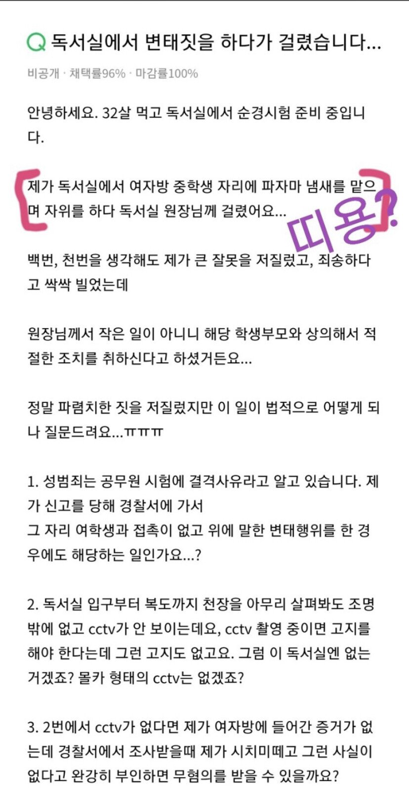 그러다 독서실 원장님께 들켰고 법적인 문제로 넘어가게 되었다. 이에 불안함을 느낀 그는 지식인에 질문글들을 올렸다.
