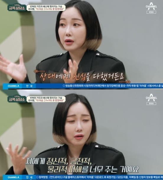 당시를 회상하며 낸시랭은 “그때 배신이 너무 충격이여서 어떤 말로도 그 상처를 표현할 수 었다”라며 “상대가 보여준 진실과 호의만큼 저도 진심으로 대했었는데 최근의 일이건 남자친구건 상대방들이 거짓말하고 금전적 정신적으로도 피해를 준다”라며 눈물을 흘렸다고 하며 이에 오은영 박사가 입을 열었습니다.